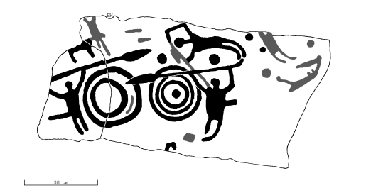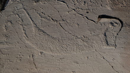 På stenblocket syns två människofigurer med sköldar och höjda spjut. Höjer de spjuten som en hälsning eller är det en bild av en strid? Om du tittar riktigt nära kan du se märken efter de knackstenar som användes för att skapa bilderna för nästan tretusen år sedan.